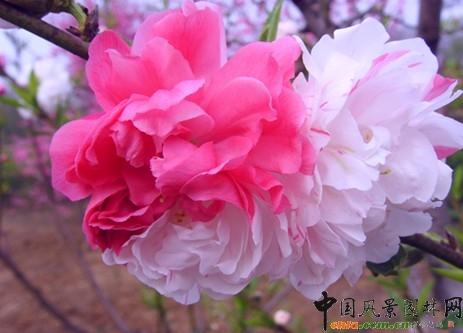 公主碧桃,在同一花枝上能開出兩色花,多為粉色或白色,觀賞價值很高。