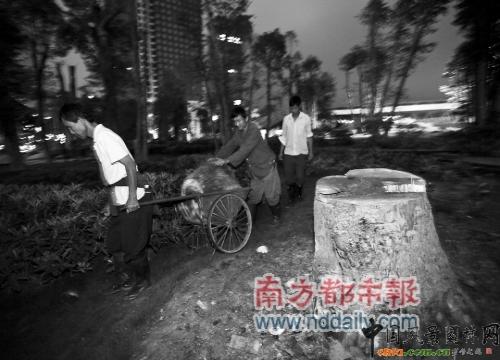前晚10點左右,有讀者報料稱花城廣場農業銀行段,有園林工人“趁深夜”在鋸掉枯死的大樹。南都記者隨后趕到現場發現,確實有10余名園林工人在農業銀行旁對幾棵枯死的多頭樟實施“鋸木”手術。