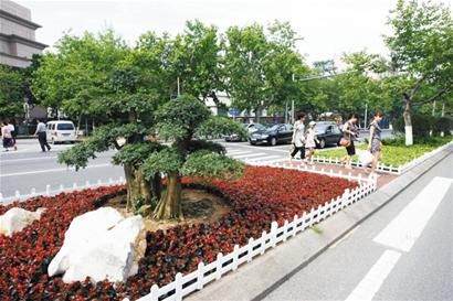 昨天上午,記者來到香港路與太平角路交界的路口,看到路中間綠化帶里多了一處像盆景一樣的綠化景觀:一株一人多高的對節(jié)白蠟葉型細小秀麗,葉色蒼翠,樹節(jié)稠密且垂直對稱,再配上旁邊的小假山石,就有了盆景那種別致典雅又不失挺秀的感覺,感覺很像一幅水墨畫。