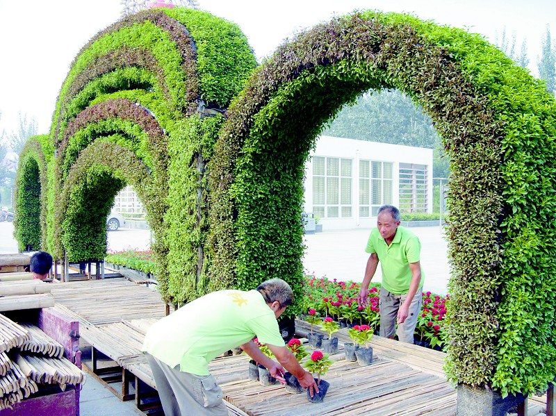 8月29日,菏澤開發(fā)區(qū)園林工人在市區(qū)擺放鮮花。為迎接中秋節(jié)、國慶節(jié)及林交會(huì),市城市管理局近日開始在市中華路、天香路和人民路等市區(qū)主要路段節(jié)點(diǎn)及公園門口擺放26處造型花卉,共用花卉近10萬盆(株)。花卉造型有花塔、轉(zhuǎn)動(dòng)花架、植物雕塑、紅旗雕塑、蝴蝶雕塑、景墻雕塑等十余種。