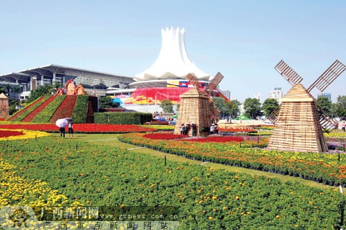 假日的民族廣場上,紅旗飄揚,鴿子盤旋,來休閑的市民紛紛被旗桿兩側的花壇吸引。只見左邊大片的花海中,架起一座綠色的拱門,拱門下面掛著紅艷艷的燈籠,烘托出喜氣洋洋的節日氣氛。鮮花中間立著的吉祥物“合合”、“歌娃娃”,更增添了一抹生氣。南寧市城市管理局廣場管理處相關負責人告訴記者,這件作品的名稱叫做“喜盈門”,代表著廣西各族人民喜迎盛會的到來。