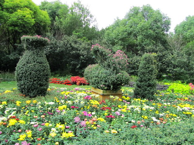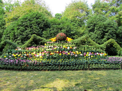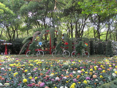 此景用各種造型菊----懸崖菊、塔菊、盆景菊、球菊等和錯(cuò)落有致的菊花構(gòu)成主景,以地被菊組成立體造型、品種菊組成流線型的花帶,反映著都市百姓豐富多彩的假日休閑娛樂活動(dòng)。