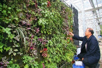 11月16日,浙江農林大學的賴齊賢教授,在研究種在植物幕墻上的各種花草生長情況。植物幕墻系列產品,是賴齊賢教授的最新專利研究成果,運用該技術可以在室內外墻上種植出各種植物,既可以節約土地,又可以綠化室內環境、調節空氣,而且該產品綠色環保、節能高效,對于倡導低碳生活也能起到積極作用。