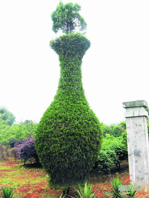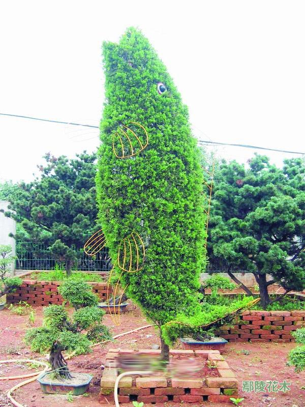 龍柏株型高大,葉片常年翠綠,具有一定的姿態(tài),易蟠扎定型,是制作造型苗和盆景的優(yōu)良樹種,常被修剪成大型花瓶、柱以及各種動物造型,在山東、江蘇、浙江、河南等地較為多見。圖為龍柏造型魚及花瓶。