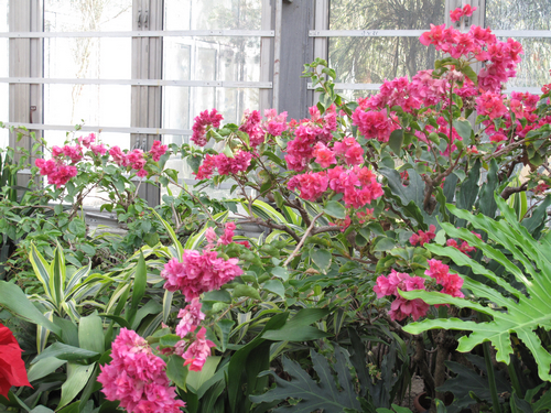 2012年的迎新花展主要在展覽溫室內(nèi)舉辦,一派紅火景象,烘托出喜慶的節(jié)日氛圍。大紅色的一品紅、紅掌、天竺葵、扶桑;紫紅色的紅花羊蹄甲、三角梅、蟹爪蘭;還有熱帶蘭花、鳳梨、麗格海棠、兔子花、何氏鳳仙等也在競爭紅色系花的主角,從桃紅色、粉紅色、橙紅色等囊括了各類紅色;辣椒“蘇格蘭童帽”的枝頭掛滿了大紅色、造型奇特的果實(shí),也加入了這場角逐。各類紅色花果擺開了陣勢,讓溫室內(nèi)紅紅火火,看點(diǎn)多多,不乏新意。