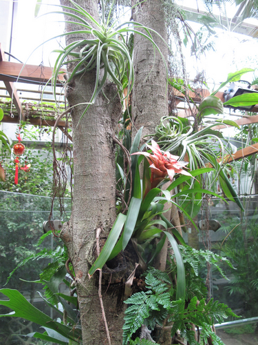 上海植物園的鳳梨科植物的收集在華東地區可謂屈指可數,數量多、品種豐富姑且不說,單單在此次迎新花展的布展形式上就極富創意的為鳳梨營造出原生態環境。原先鳳梨大多布置在花盆里作為地被使用,現在的鳳梨依附在樹枝上,似相生相伴,別有一番景致。紅色系的鳳梨主要有“吉利紅星”,火炬果子蔓等。