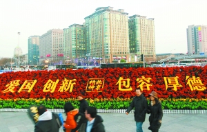 昨天,市民從東單路口剛剛搭建完成的北京精神主題花壇前走過。為更好地宣傳北京精神、增添喜慶的節日氛圍,東單、西單、首博、中關村廣場等京城繁華路段陸續搭建完成9處北京精神大型景觀花壇。本報記者 孫戉攝
