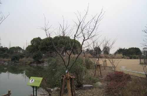 如今,這株櫻花已不再煢煢孑立,形影相吊。在去年末的櫻花景觀改造中,園方將老櫻花樹對面的水體駁岸進行了清理,并栽植了“十月櫻”Cerasus×subhirtella“Autumnalis”、“雨晴枝垂”Cerasusspachiana“Ujou‐shidare”、“小彼岸”Cerasussubhirtella(Miq..)Masam.&S.Suzuki、“陽春”Cerasus“Yoshun”等4個新的日本櫻花品種,與對岸孤植的大櫻花和整齊的水杉林遙相呼應。