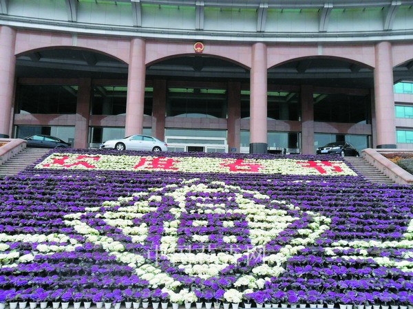 圖為青島開發區政府部門大門口,為營造春節氣氛,數百盆的羽衣甘蘭組成一個大大的“福”字,配合用亞可力板制作而成的“歡度春節”四個紅色大字,營造出色彩奪目的節日氛圍。該設計還裝配了燈光設施,增強夜間觀賞的效果。