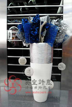 以藍、銀鋁片加鐵絲球,與同色玉蘭花搭配,方與圓的特殊手法,給人創新突破新視覺。花材:藍銀鋁片、鐵絲球、玉蘭花。