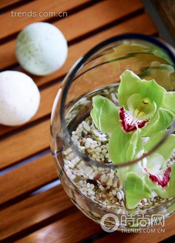 4.這是常見(jiàn)的插花手法:花朵深深地沉浸在水晶杯之中,沐浴著清靈的水體,有白色碎石為它墊底;水中花有著更加適宜的舒適生存環(huán)境。