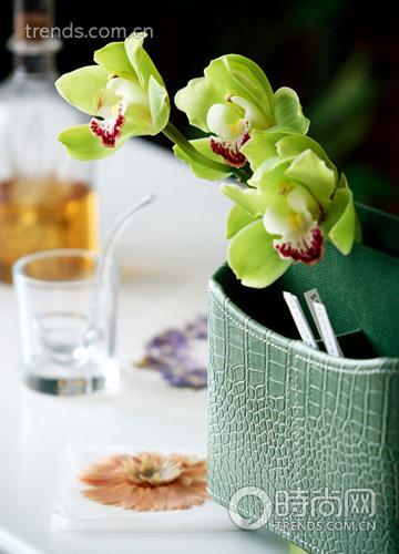 6.蕙蘭幾乎是百搭的花材,似乎無(wú)論將它放在哪個(gè)位置都能出彩。書桌上草綠色的革質(zhì)便簽盒有著不一樣的質(zhì)感,恰好可以和同色系嬌嫩的淡綠花朵作呼應(yīng)。