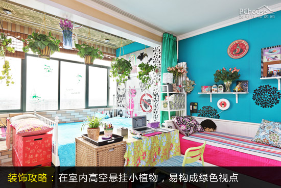 將盆栽植物在室內高空懸掛,易構成綠色視點,尤其在有限的室內空間內,結合天花板、燈具一起裝飾效果最佳。在光線良好的窗臺上方掛綠色盆栽,既可節省小空間的局促,又可讓空間豐富又不雜亂。