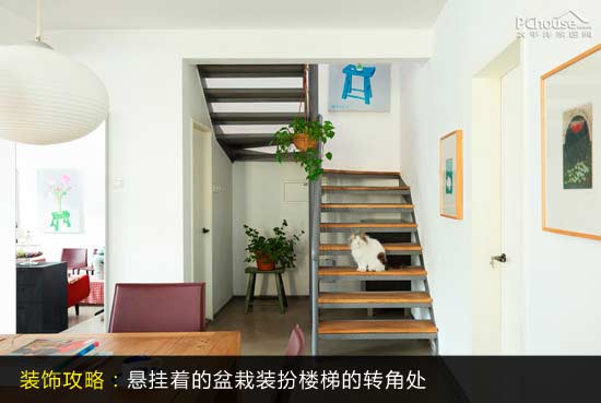 綠色的小盆栽搭配清新的畫框作品,為樓梯拐角的有限空間增添生機感,隨著樓梯的轉動,看到盆栽和畫作的交錯,還有種進入藝廊的奇妙感覺。