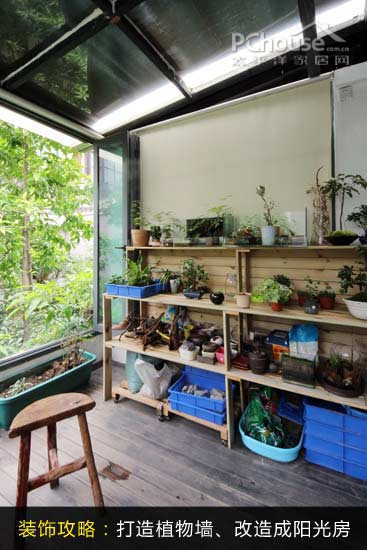 將陽臺就改造成陽光房,頂上安裝電動天幕,把花園改成了植物墻裝飾,改善了墻壁生硬的線條造成的枯燥單調感,營造生動活潑的空間立體美感。