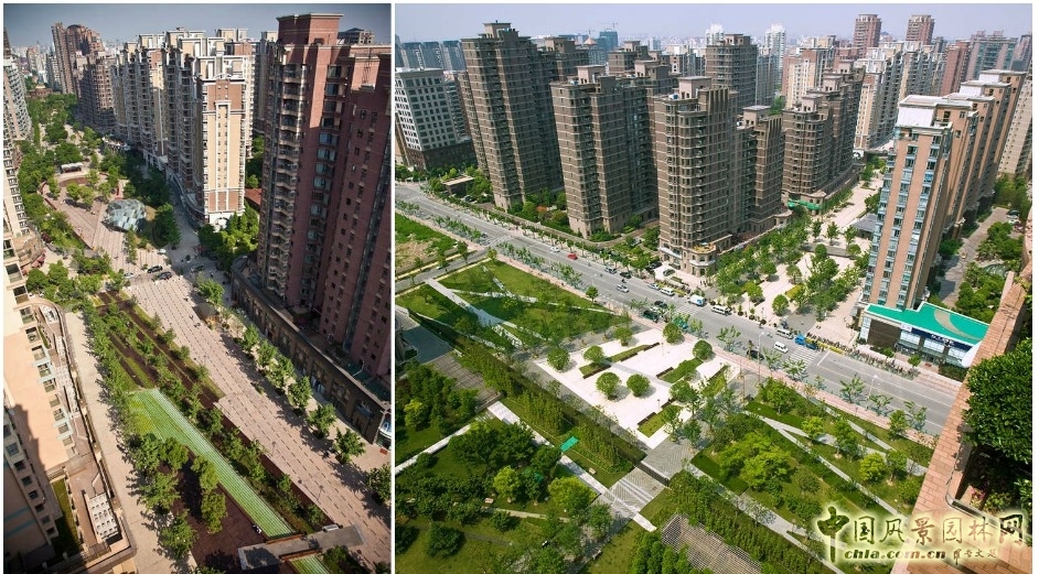 中國風景園林網訊:SWA事務所受上海古北(集團)有限公司委托為繁華的上海構思設計一個獨特的步行街(古北黃金城道步行街)。這個步行街覆蓋了三個城市街區,兩側是20層的住宅大廈,在路邊是零售商店,步行街的兩端是SWA事務所設計的公園。