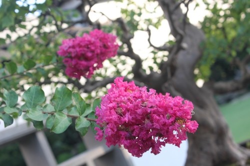 上海植物園盆景園內紅花紫薇盆景開得正絢爛,蜿蜒扭曲的枝干上,紫紅的花朵一簇一簇,堆集于自然舒緩的枝頭,給滿目青翠的盆景園點綴上亮眼的一筆。此株紫薇已有六七十年歷史,現在每年都盛開,炎炎夏日里很受游客們的青睞。盛夏綠遮眼,此花紅滿堂,若是心有意,何不賞花來?