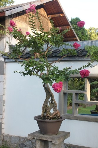 北方人叫紫薇樹為“猴刺脫”,是說樹身太滑,猴子都爬不上去。它的可貴之處是無樹皮。物以稀為貴,世界上千樹萬木之中有幾種是無皮的?年輕的紫薇樹干,年年生表皮,年年自行脫落,表皮脫落以后,樹干顯得新鮮而光滑。老年的紫薇樹,樹身不復生表皮,筋脈挺露,姿態婆娑,制作成盆景后十分婀娜大方。紫薇樹長大以后,樹干外皮落下,光滑無皮。如果人們輕輕撫摸一下,立即會枝搖葉動,渾身顫抖,就像給怕癢的小姑娘一樣,笑得花枝亂顫。