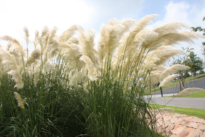 蒲葦(Cortaderia selloana)為禾本科蒲葦屬的多年生叢生草本植物,雌雄異株,莖稈高大粗壯,可達2-3米,葉聚生基部,如絲狀彎垂。每到夏季,蒲葦便伸出長長的花序,大型而稠密,長度可高達1米,銀白色花序自成一把,宛如羽毛狀的刷子。辰山植物園引種種植了蒲葦及“玫紅”蒲葦(‘Rosea’)、“矮”蒲葦(‘Pumila’)、“花葉”蒲葦(‘SilverComet’)等多個品種,面積累積達200多平方米,頗為壯觀。此外在巖石草藥植物園、礦坑花園也有栽培。