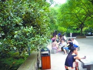 昨日,市民在鵝嶺公園盛開的桂花樹旁休閑聞香。 記者 陳軍 攝