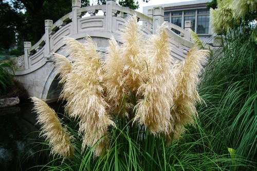 在上海植物園薔薇園的河邊、溫室大草坪都可以看見蒲葦的身影,不過,最美的還是點綴在河邊的,那一枝枝密集盛開的毛絨絨的花穗,仿佛西洋油畫中古典婦人夸張的羽毛頭飾,下面密密的、下垂的修長葉片,又似拖曳的綠色紗裙,這樣靜靜佇立在水岸邊,落落大方,不卑不亢!難怪我國古樂府詩集中《孔雀東南飛》的女主人公發出“君當作磐(pán)石,妾當作蒲葦”的誓言!想必除了“蒲葦紉如絲”的秉性,還有這落落大方的氣質吧!