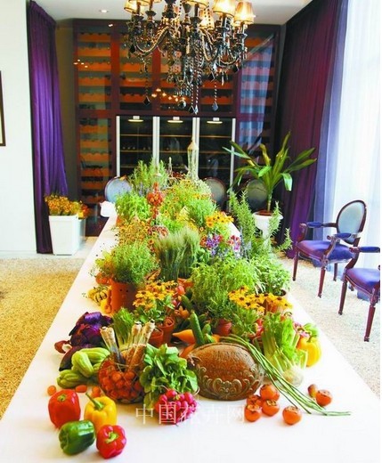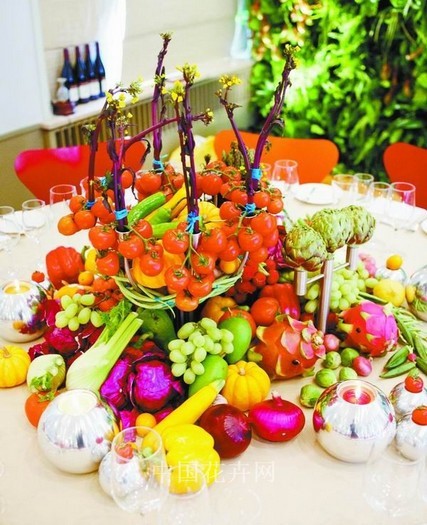 蔬果為何適用于宴會(huì)餐桌設(shè)計(jì):克里斯汀主要承接高端婚禮和宴會(huì)的花藝設(shè)計(jì)業(yè)務(wù),相對(duì)來說,婚禮花藝設(shè)計(jì)追求浪漫,最適宜用鮮花表現(xiàn),而宴會(huì)花藝設(shè)計(jì)則追求氣氛的熱烈和融洽,尤其是餐桌花藝的設(shè)計(jì),要讓賓客心情愉悅,胃口大開,新鮮的蔬菜和水果就可以大顯身手了。尤其在公司內(nèi)部聚餐和家庭宴會(huì)設(shè)計(jì)中,蔬菜水果的運(yùn)用倍顯溫馨親切。