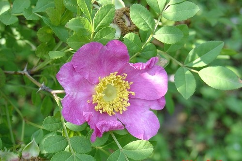 繅絲花(Rosa roxburghii)與薔薇、月季是同一個家族的,同屬薔薇科薔薇屬,所以它的花和薔薇的花很相似。8—11月是果實的成熟期。果實扁球形,成熟時黃色,外面密生很多針刺,又名刺梨。果實又酸又甜,據測定,它是維生素C含量最多的水果,被譽為“維生素C之王”。果實可直接食用,也可熬糖、釀酒。園區里栽植的繅絲花是重瓣品種,主要用于觀花,不會結果。