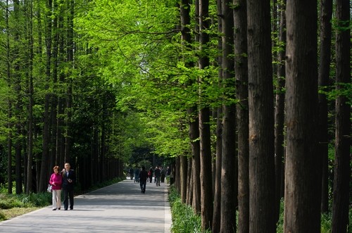 上海植物園有一條美麗的大道,那就是位于展覽溫室、蘭室、盆景園中間的一條水杉大道。雖然這水杉路并不很長,但仍不能否認它是植物園內最美麗、最具特色的一條道路。