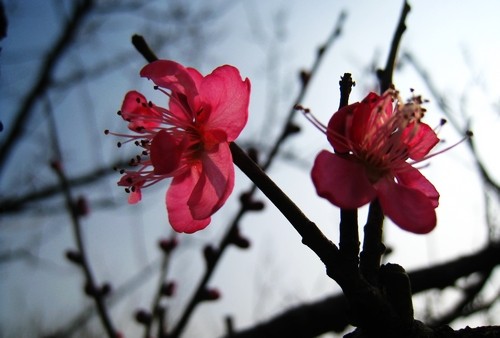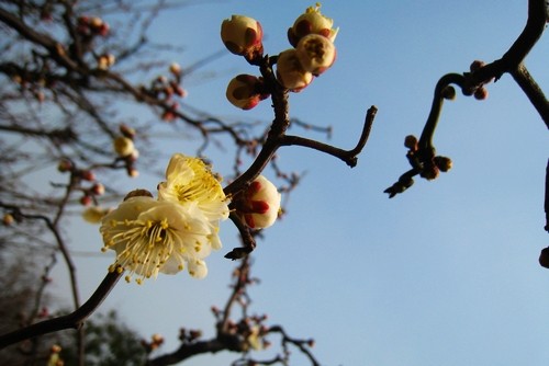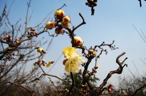 2月4日便是立春了,隨著近期氣溫的快速回升,上海植物園薔薇園里的梅園已不再是寒風(fēng)蕭瑟,“報(bào)春粉”梅、單瓣的朱砂梅、粉白色的“江梅”等一些花期較早的梅花Prunus mume品種已星星點(diǎn)點(diǎn)地在枝頭綻放,迅速傳遞著春天的消息,而其中,最引人矚目的人氣王,當(dāng)屬“玉蝶龍游”梅。