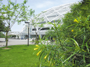 嶺南明珠體育館綠地上栽種著開黃花的夾竹桃,易被兒童采摘誤食
