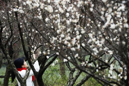 游客在杭州西溪國家濕地公園的梅林中探梅