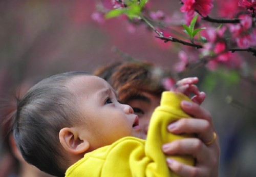 在廣州白云山桃花澗,一名家長抱著小朋友在觀賞桃花
