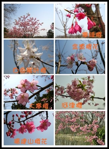 靠近薔薇河邊南岸和牡丹園岸邊,以福建山櫻花(即也名‘鐘花櫻’)為主的我國原生櫻花和日本早櫻花品種也紛紛盛開,其中紫色‘寒緋櫻’、淡紅、桃紅色的‘福建山櫻花’均是我國原生櫻花中的上品,以它們為親本雜交培育的日本早櫻花品種‘河津櫻’Prunus× kanzakura ‘Kawazu-zakura’、‘修善寺寒櫻’Prunus × kanzakura ‘Rubescens’、‘大寒櫻’Prunus × kanzakura ‘Oh-kanzakura’等,樹體高大舒展,花枝花芽密集,點綴河岸,與牡丹園岸邊原有的白玉蘭遙相呼應,正將岸邊法國梧桐、觀賞草枯黃的冬色驅散……
