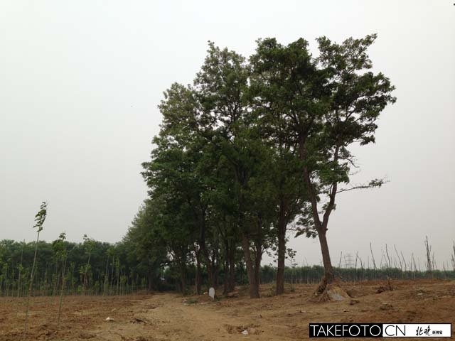 下午三點(diǎn)多,通燕高速路南側(cè)車輛不斷地呼嘯而過,灰塵高高揚(yáng)起。而在路北側(cè)的這片樹林里,沒有揚(yáng)塵,沒有車輛飛馳而過時的隆隆聲,只有村民們打牌的嬉笑聲。離林地入口十多米遠(yuǎn)的一個小廣場正中,“三八國際友誼林”的石碑是這里唯一的標(biāo)志物。石碑以北是大片樹林,以槐樹、楊樹和柳樹為主,林間邊緣的大片空地是村民們休閑聊天之處。