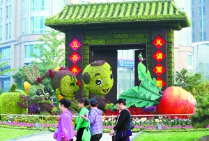 昨天,一位游客被擺放在東單路口東南角的“五谷豐登”國慶花壇迷住了。“怎么能拼得這么像!”這位游客盯著花壇琢磨了半天,百思不得其解。