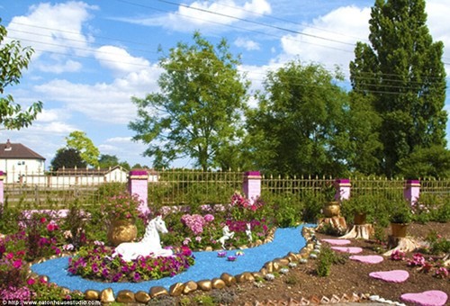 這棟別墅的外墻刷著粉色油漆,而內(nèi)部則有一個裝點著獨角獸雕像的小花園,周圍散落著許多粉色花朵,其間也有鵝卵石和羊腸小徑蜿蜒盤繞。