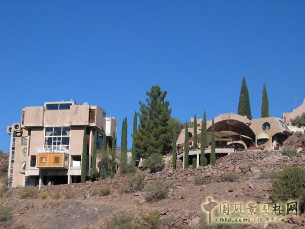 作為最早的新能源試驗站,阿科桑蒂的實施建設堅持兩個基本原則:降低能源消耗和降低汽車使用量。它利用沙漠中最強大的能源——太陽,作為自己所計劃城市的動力之源,采用獨特的圓穹頂篷和高塔式建筑風格,為現代建筑的自然采光和通風系統設計提供了實用和審美相融合的完美范本。同時,腳踏車是社區的主要交通工具,汽車在這種城市是不被允許的,全部的食物、熱源、冷源和各種生活需要可以通過建筑設計和運用物理學的效應而得到。