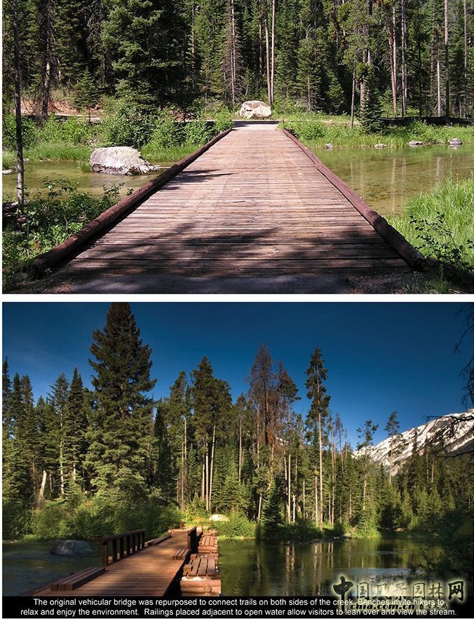 大提頓國家公園(GTNP)每年大約會吸引300萬游客,如同其他的著名景觀一樣,這里正面臨著被游客喜愛——大量游人來訪——景觀被毀的危險。在項目的開端,勞倫斯·S·洛克菲勒要求設計師挑戰傳統的國家公園游覽方式,改變游客在景觀中的體驗形式。景觀設計師通過尋訪未被開發和具有表現力的高品質景觀,屏退人群的影響,使其返回原始的自然狀態等舉措,回應了他的要求。停車場和下客區與解說中心分開,位于欄桿旁。交流中心位于艾草草甸邊緣,這里之前是牧場的住宅。所有的建筑都被地勢和植被自然的分隔開來,同時又通過道路系統相互連接。