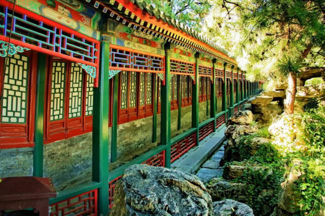 一般抄手游廊是進門后先向兩側,再向前延伸,到下一個門之前又從兩側回到中間。在院落中,抄手游廊都是沿著院落的外緣而布置的,形似一個人抄手(將兩手交叉握在一起)時,胳膊和手形成環狀,所以叫 “抄手游廊”。