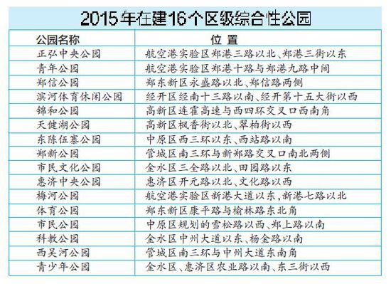 繼去年10個區級綜合性公園開園后,今年,16個區級綜合性公園納入將抓緊建設進度,預計年底前將再建成10個公園:正弘中央公園、青年公園、鄭信公園、濱河體育休閑公園、錦和公園、天健湖公園、東陳伍寨公園、鄭新公園、市民文化公園和惠濟中央公園。