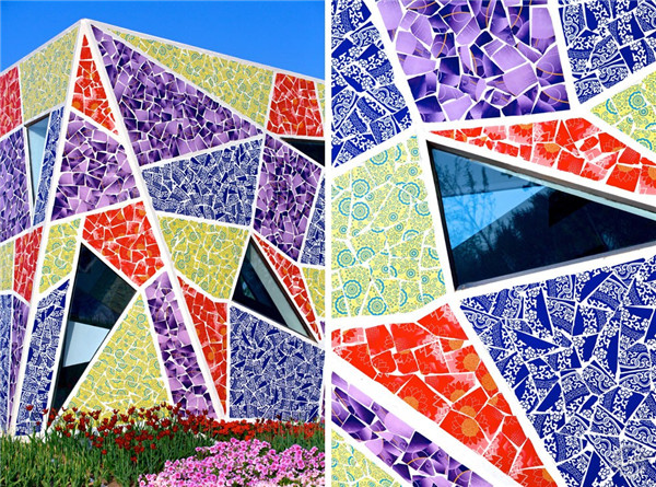 并且,這個幾何形狀表現為由當地中國碎瓷片組成的四種不同類型和顏色的花朵的多色馬賽克圖形。花朵和陶瓷形成多彩的馬賽克,將自然和本土技藝聯系在一起。