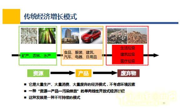 這種工業(yè)發(fā)展的模式可以概括為傳統(tǒng)的線性發(fā)展模式,資源采掘——形成產(chǎn)品——消費(fèi)——廢棄物——填埋處理,這種模式運(yùn)行中以大量的使用化石燃料、機(jī)動(dòng)車,城市蔓延式擴(kuò)張、追求大而舒適為目的。它是一種大量生產(chǎn)、大量消費(fèi)、大量廢棄的經(jīng)濟(jì)模式,使人類的生活從搖籃走向了墳?zāi)埂?/p>