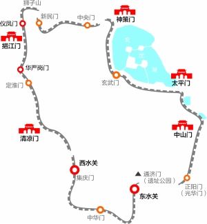 按照規(guī)劃,南京明城墻分為5段打造:神策門-太平門;太平門-東水關(guān);東水關(guān)-西水關(guān)(秦淮區(qū));西水關(guān)-獅子山;獅子山-神策門。