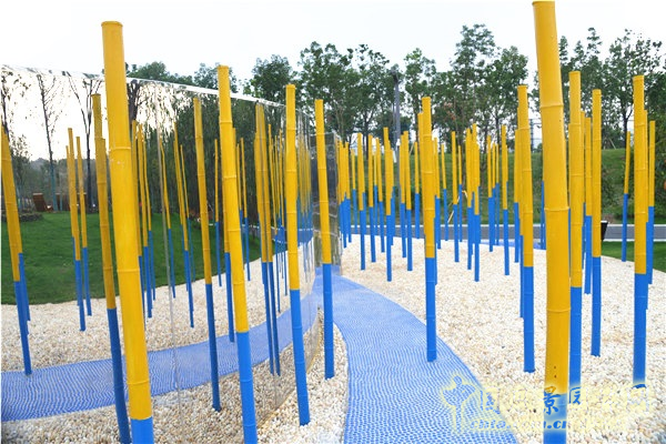 沿著藍色碎石鋪就的螺旋形小徑進入花園,可以看到一片竹林,每一棵竹子的上半部分都被涂成黃色,而下半部分被涂成藍色,黃色與藍色的交接點連成一線,水平的線條與豎直的竹子形成強烈的視覺對比,營造出“地平線”的意境。