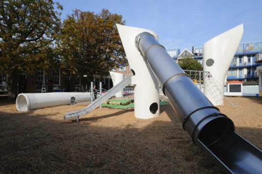每個人都對一個新的風力渦輪機感興趣,但是很少考慮當它們壽命已盡,該如何安置它們。荷蘭是利用風力而著稱的國家,一家創意公司認為風力渦輪機的葉片和塔樓應有更大的用途。Wikado游樂場是由鹿特丹建筑事務所Superuse Studios設計,使用5個廢棄的風輪葉片建造了這個游樂場,并設計了迷宮、通道、塔樓和滑梯。