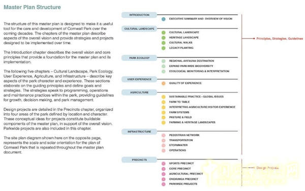 總體規劃基于與康沃爾公園管理者、員工合作設定的發展原則的指導,多樣的規劃顧問團隊由生態學家、考古專家、歷史學家、工程師及服務行業的專家組成。