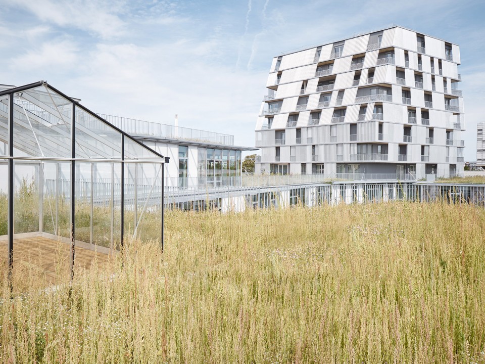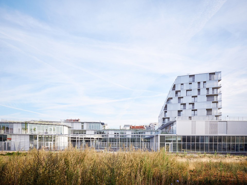 校園位于伊夫里的Confluences ZAC區(qū)(城市開發(fā)區(qū)),毗鄰巴黎,且與城市開發(fā)項(xiàng)目中的多條運(yùn)輸線及公路網(wǎng)絡(luò)相連接。該項(xiàng)目是第一批入駐ZAC的項(xiàng)目之一。所在的基地環(huán)境,基于不同城市尺度的兩個(gè)層面,正在經(jīng)歷重大的轉(zhuǎn)變:其一是開放的水平向的景觀,面朝Dominique Perrault設(shè)計(jì)的凈水植被園地,另一個(gè)是更加本地化的以學(xué)校綜合樓和學(xué)生宿舍為核心的新興社區(qū)。