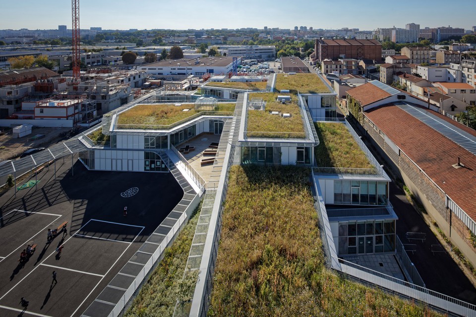 學生宿舍的設計基于4個主要建筑學原則。首先,項目作為一個整體要具有合理的功能(結構和技術空間的疊加),同時還要緊湊。距離其他功能分區的距離使它有所脫節,具有一定的獨立性。由于宿舍區被設置在盡可能北的方位,最窄的立面朝向Jean-Jaurès大街,平臺不會阻擋陽光進入室內。這也保證了操場能夠享受足夠多的陽光。