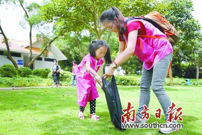 珠海堅持綠色發展,踐行生態文明,努力形成人人關心、人人支持、人人參與、共建共享的濃厚氛圍。圖為“一大一小”志愿者共同呵護生態環境。王榮 攝