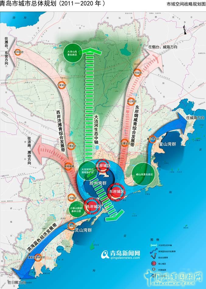 ◆北岸城區:是青島市域城鎮布局的空間中樞,以高水平打造科技型、生態型、人文型新城區為目標,合理控制開發時序,為建設青島市未來的公共服務和公共管理中心預留發展空間。